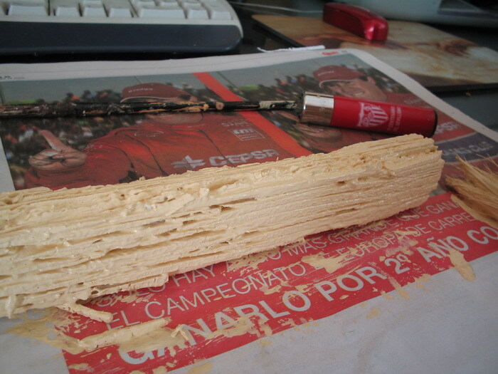 Los pasos son buen sencillos, una vez q esta seca la capa de escallola, damos primeramente una capa uniforme de tinte de nogal con un pincel grande para intentar cubrir la superficie. Despues damos una segunda mano con el pincel sin tener en cuanta q qde uniforme, ya q precisamente esos defectos que se crean al secarse de forma diferente seran las betas de la madera, y el sentido q utilicemos es el q tendran las betas al final. Por ultimo aplicamos con un pincel una capa con el betun, también en el mismo sentido pero no uniformemente para crear betas.