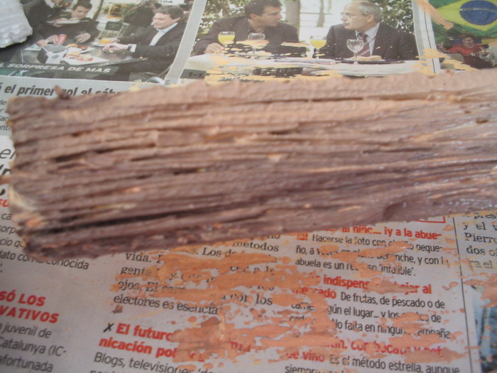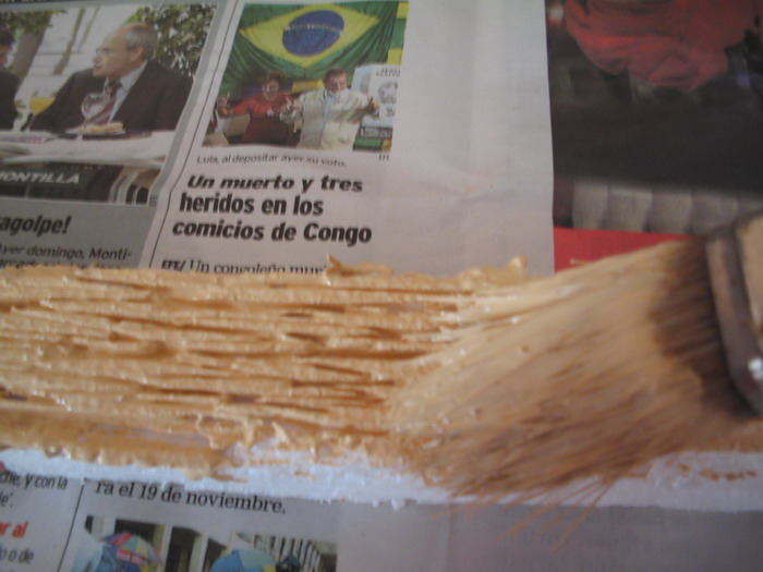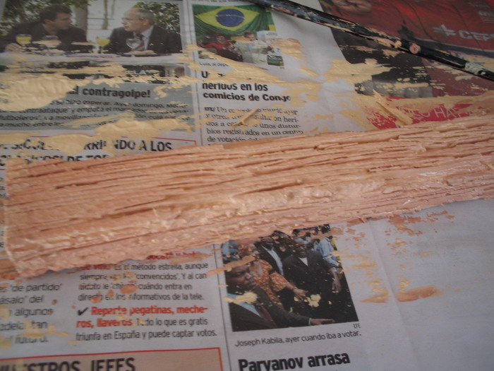 Los pasos son buen sencillos, una vez q esta seca la capa de escallola, damos primeramente una capa uniforme de tinte de nogal con un pincel grande para intentar cubrir la superficie. Despues damos una segunda mano con el pincel sin tener en cuanta q qde uniforme, ya q precisamente esos defectos que se crean al secarse de forma diferente seran las betas de la madera, y el sentido q utilicemos es el q tendran las betas al final. Por ultimo aplicamos con un pincel una capa con el betun, también en el mismo sentido pero no uniformemente para crear betas.