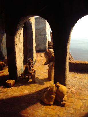 Y sobre todo me ha gustado un diorama marinero, a la penumbra, con figuras que creo que son de Alina, con un precioso lobo de mar con gorra de plato y fumando en pipa (puro Haddock) que es una composición de los alumnos del año pasado del cursillo de pesebres, ascendidos a la categoría "senior".