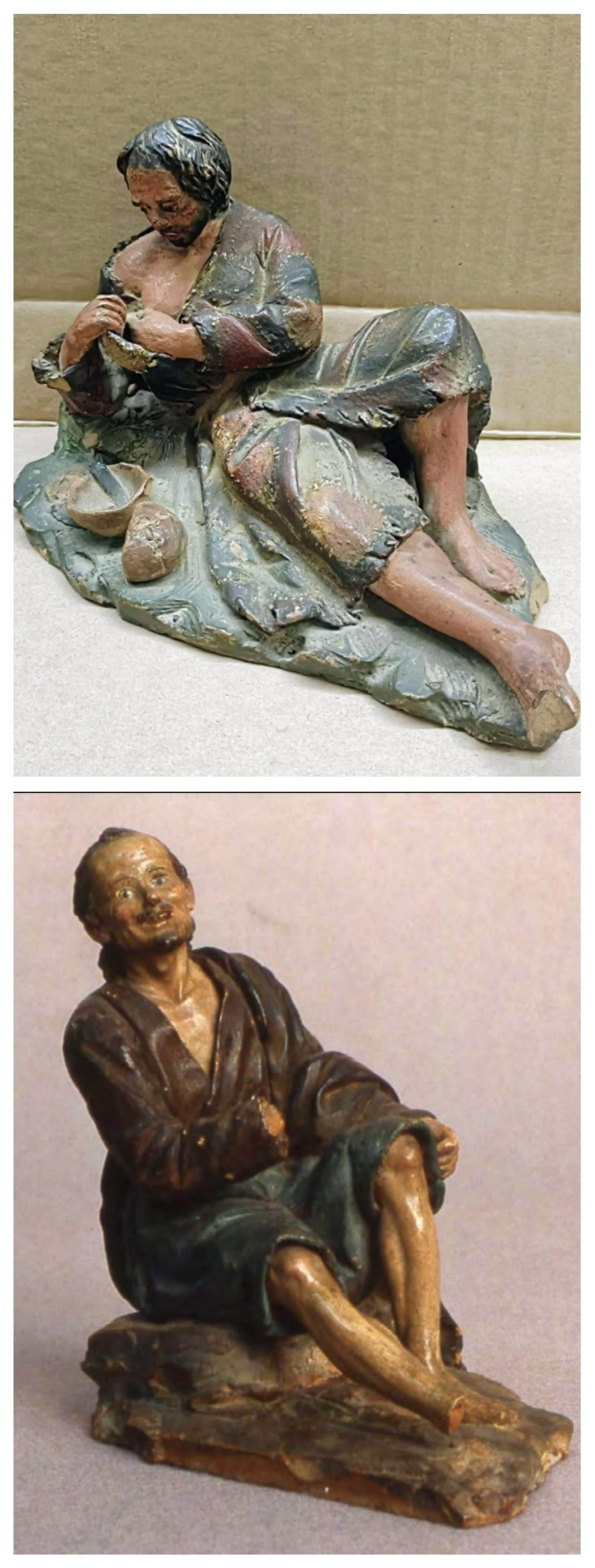 A pesar de que estas figuras son de mayor tamaño y presentan más detalle, encuentro que la figura en estudio tiene semejanzas estilísticas: la forma de trabajar la expresión del rostro, el cabello, la pintura y los ropajes. Creo que existen indicios suficientes para una duda razonable. ¿Qué opináis? Seguiré con alguna comparativa más.