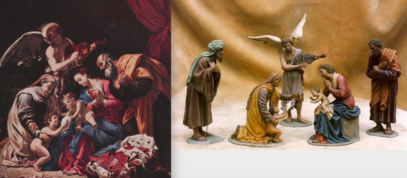 La primera es de todos conocida, las llamadas figuras de Murillo de 30cms., del cuadro "La adoración de los pastores", después con montajes comparativos con otros cuadros del pintor barroco, figuras de Reyes de molde de 8cms, Virgen(8) tb molde y palillo de 5cms de ángel de Martí Castells.