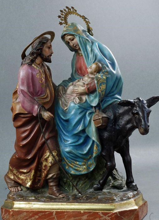 Creo pudo ser la fuente de inspiración para la figura compacta de Virgen montada en asno y San Jose , de la escuela de Olot, ARTE SELECTO. PROVEEDORES PONTIFICIOS VICH (ver fotos)
