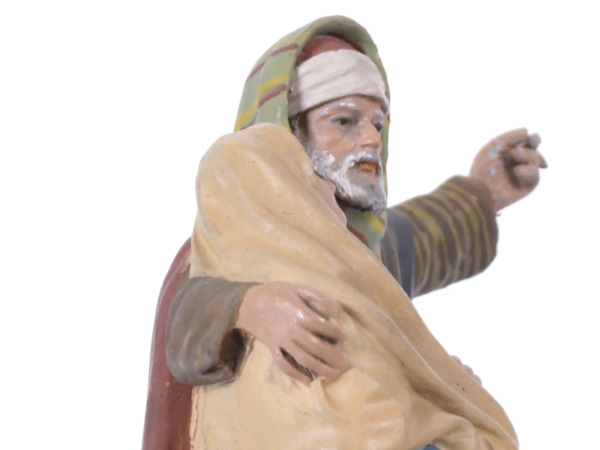 Se aprecia que la mano que señala presenta desconche de la pintura , y al estar el dedo doblado y por el color grisáceo, es de suponer, que esta mano es de plomo ( no así las otras). Como curiosidad cabe decir que a modo de lapsus al pintar, se quedó sin pintar en la parte trasera de la figura, las rayas amarillas de la manga derecha de San José. Pero si cabe esto le da más valor a la pieza.