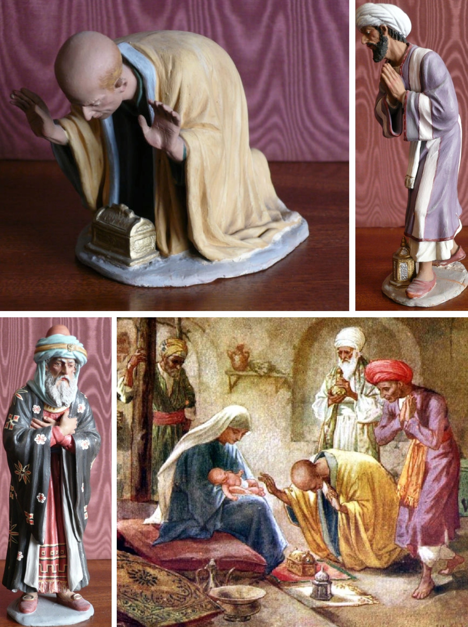 Otro tanto de lo mismo con la lámina de la epifanía de William Hole. Por ejemplo con los reyes adorando de 15cms., Melchor es la adaptación del motivo, varía a Baltasar y modifica totalmente a Gaspar y,
