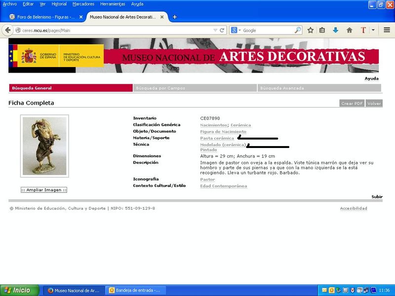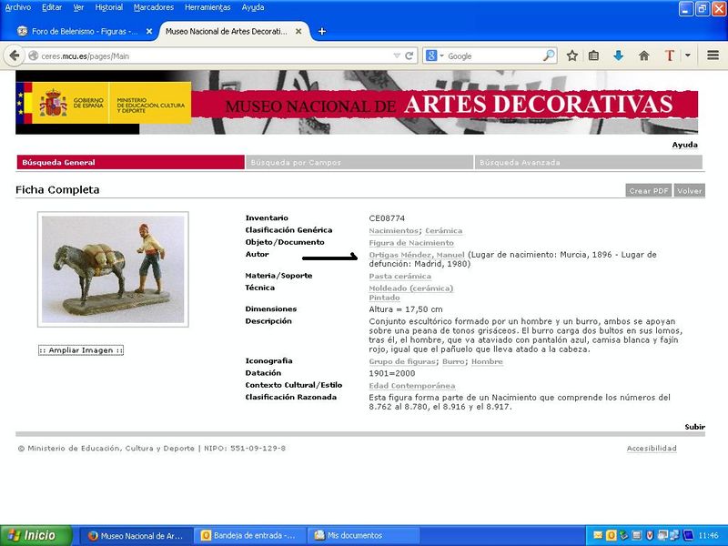 El de Artes Decorativas está bastante mal, aparte la clasificación, el moverte por él es farragoso (vienen unas 876 figuras),...ves que en la parte superior (a la derecha) en una letra grisilla te pone Mostrando 1 - 24 de 876 Página 1 de 37 , dando en siguiente puedes ir viendo las viñetas (para entrar en las fichas),...por autor también puedes buscar, yo creo que está mal estructurado además de mal clasificado y el relleno de las fichas digamos que deja mucho que desear (por no decir que no tienen ni idea) para ser un museo nacional,...como ejemplo te pongo esta figura de OLOT evidentemente de escayola y en la descripción del material: Pasta cerámica,...vamos, que te vas por las pencas...