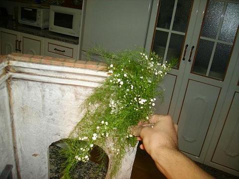 Aquí tienes infinidad de soluciones. Se trata de pegar a la anterior unos copitos imitando la flor de jazmín, distribídos por doquier. Puedes usar cominos, granitos varios de otro tipo de especies (abre tu despensa, yo tengo al menos 20 en botecitos), pizquitones de pasta DAS si quieres, etc. Una vez pintados o no ( yo los pintaría una vez colocados; con pasta DAS ni siquiera esto, ya queda blanco) los pegas con cianocrilato a la esparragera; distribuídos como hemos dicho.