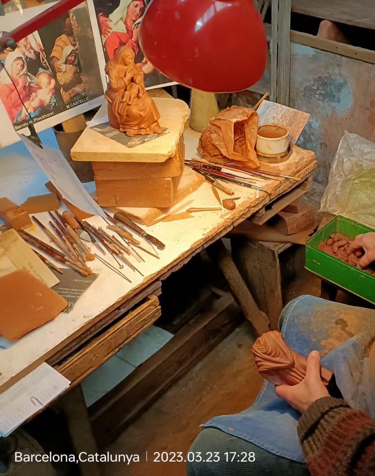 Cómo pasa el tiempo...El 23 de marzo de 2023, en su lugar de trabajo y creatividad, estaba modelando la figura de la Virgen y el Niño , basándose en la ilustración de El descanso en la huida a Egipto de Bernard Plockhorst.