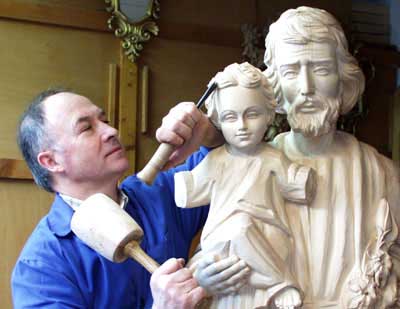 Todas las obras se hacen con maderas del país, como el tilo, el nogal, el roble o el pino, y son policromadas al óleo o se terminan con acabados naturales, teñidas con un tinte al agua y cera natural.