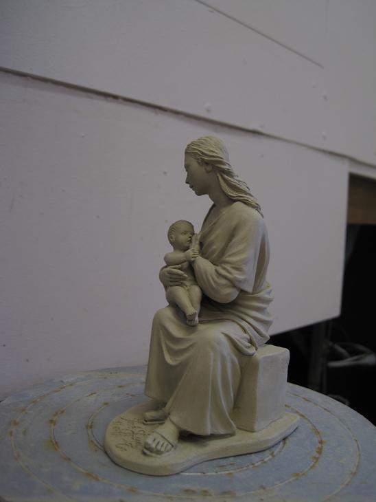 La verdad es que sí, para que se le vea bien la cara al niño y a la virgen desde un mismo ángulo tuve que poner al niño en esa posición y como me resultaba raro pues le puse la manita sobre la mano de la virgen como si estubiera tomando impulso para llegar hasta el pezón.Es cuestión de estética mas que de naturalidad la posición que le he dado al niño ya que es una postura complicada para representar con naturalidad y que quede bien esteticamente,por ello tiene la cabeza erguida.