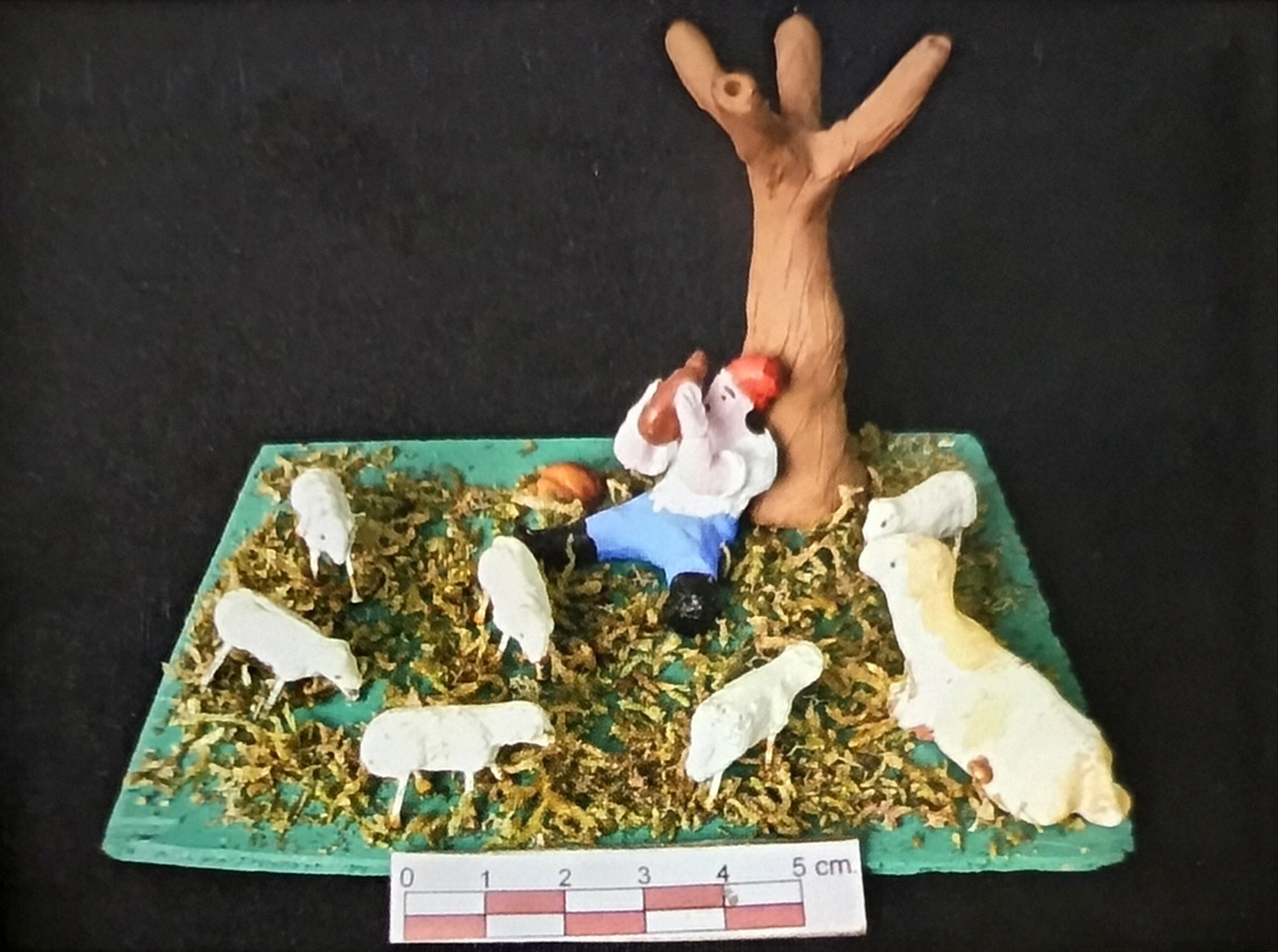 Josep Llobet realizó escenas de cacharrería populares que representaban actividades cotidianas o costumbristas, como esta de 'mujer que mata un pato' o grupos en peana de madera, como este pastor con su rebaño.