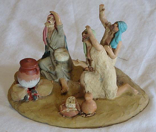 Los Reyes que "van" con las figuras de camino de Antoni no son los que cuelga Felorz, sino éstos, que ya os pusimos en el hilo de oro, incienso y mirra... y es seguro porque yo las tengo pintadas y en crudo con los mismos pastores, serían el producto más estándar. Las anteriormente exhibidas me parecen de una ejecución más delicada, y más antiguas. Sigo pensando que Pep del Nas trabaja en muchos casos con moldes o materiales más antiguos.