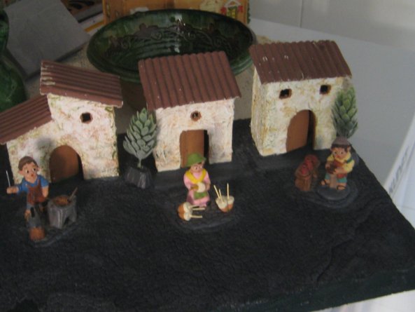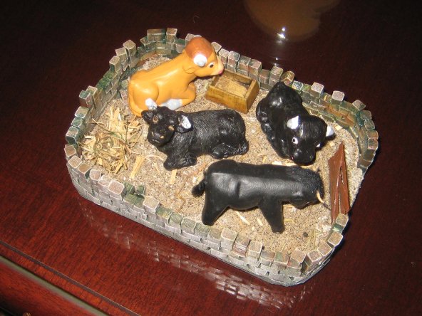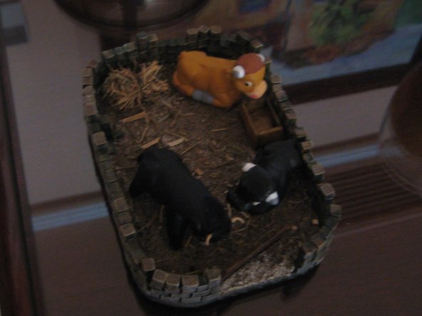 Cuando montes el belen planteate poner, de los negros, el que esta de pie o alguno tumbado fuera del cercado, si te fijas en tu primera foto donde solo hay tres queda todo mas espacioso, a mi me gusta mas, y uno fuera quedara bien ya veras.