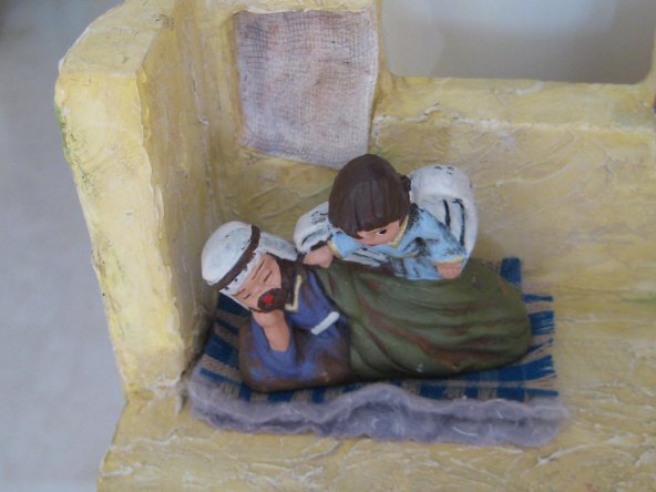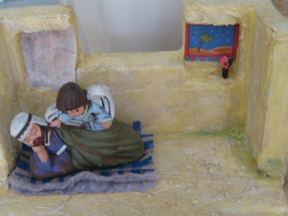 volviendo al sueño de s.José, ¿la cortina ,el color un poco soso? tengo que poner algo de techo en la esquina para esconder la bombilla que le ilumine la cara, ¿maderos, toldo ,vigas? sujeridme, porfa.