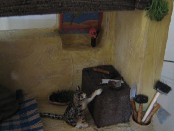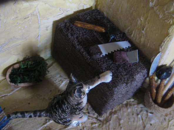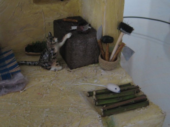 Precioso Pilar, te ha quedado fenomenal, me encantan los detallitos, el gatito, el ratón, las herramientas, todo perfecto; bordas la miniaturas, con lo dificiles que son hacerlas tan chiquitas, tienes buena vista, yo para cosas pequeñas ya tengo que usar lupaaaaaaaaaa, jajaja.