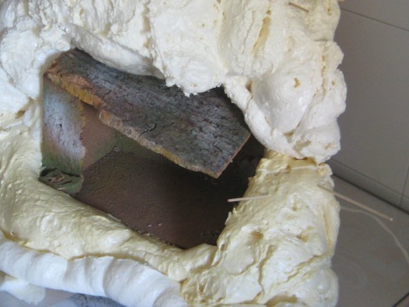 ahora voy a encastrar el portal en una montaña. Lo lío en plástico, para que no se estropee, no es que la construcción valga mucho, pero es la que le puse a mis hijos siempre y le tengo cariño. El film es para cuando la montaña esté completamente seca, me permitirá despegarla sin haber tocado el portal, con dos cortes de cúter, será una montaña de quita y pon. Bueno, ¡manos a la obra!