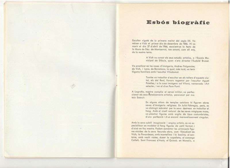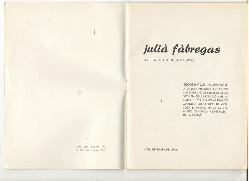 "Julià Fàbregas: Artista de les figures humils". Recordatori homenatge a la seva memoria. Edit L´Associació de Pessebristes de Vich/ Caixa D´Estalvis Comarcal de Manlleu. Patrocini Comissió de L´Eccm Ajuntament de Vich. Desembre del 1966. D.L B-35189-1966