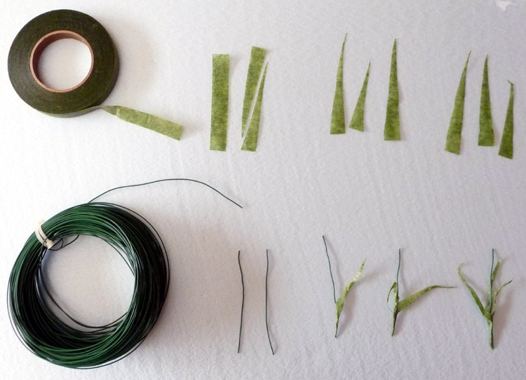 Cortar trocitos de alambre con unos alicates y enrollar uno a uno desde la base los tres trocitos… que serán nuestras hojas… los colocaremos enfrentados. Echaremos una gotita de cola blanca en la unión para “fortalecer” nuestro junco.