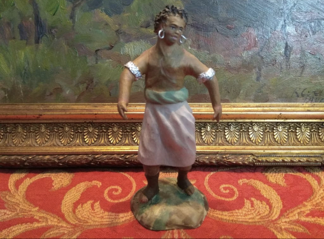 Una mujer de raza negra donde llama poderosamente la atención las dos argollas metálicas que cuelgan de sus orejas. En este mismo hilo, subieron una figura de Rada con este atributo. La postura de los brazos da la sensación de que su oficio era el acarreo. No sabría precisar si bajo los brazo o cargadno algo entre ellos. Aunque el torso y las extremidades estén poco definidas en su ejecución, llama la atención le moldeado del cabello negro y rizado, propio de esta raza; así como los rasgos del rostro. No se ve que sea un molde neutro que se haya dado ese color, sino que el artesano sabía lo que estaba queriendo hacer.
