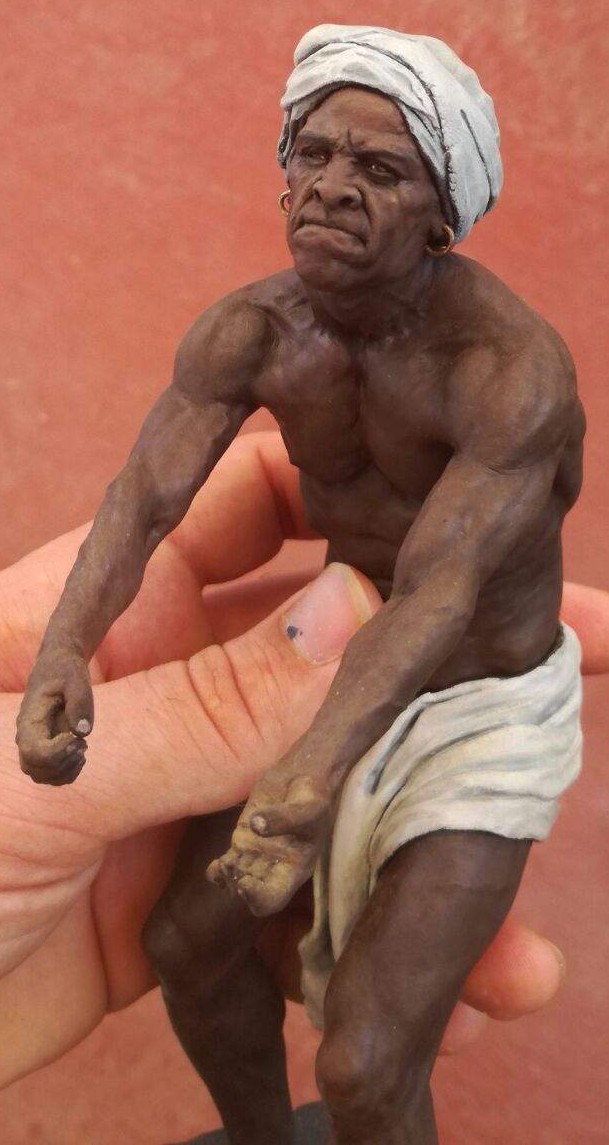Una mujer de raza negra donde llama poderosamente la atención las dos argollas metálicas que cuelgan de sus orejas. En este mismo hilo, subieron una figura de Rada con este atributo. La postura de los brazos da la sensación de que su oficio era el acarreo. No sabría precisar si bajo los brazo o cargadno algo entre ellos. Aunque el torso y las extremidades estén poco definidas en su ejecución, llama la atención le moldeado del cabello negro y rizado, propio de esta raza; así como los rasgos del rostro. No se ve que sea un molde neutro que se haya dado ese color, sino que el artesano sabía lo que estaba queriendo hacer.