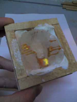 3. desmoldada la cara preparo un pequeño molde con cuatro palos, para que no se me mueva y relleno de escayola, dejo secar.
