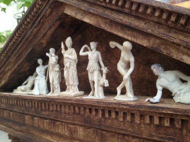 La Fuente de la Fortuna, es un proyecto que llevábamos en mente desde hacía tiempo. Es una fuente a tamaño real de construcción greco-romana arquitectónicamente hablando. Las figuras clásicas que aparecen en el frontón sin griegas, y dos de ellas tuvieron que ser modificadas.  La segunda por la izquierda era la Venus de Milo, y la transformamos para que estuviera sentada y con brazos.