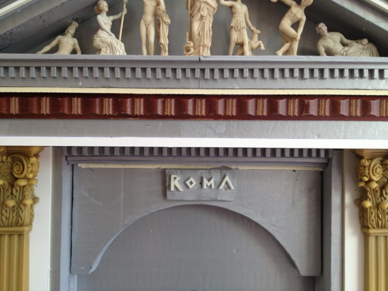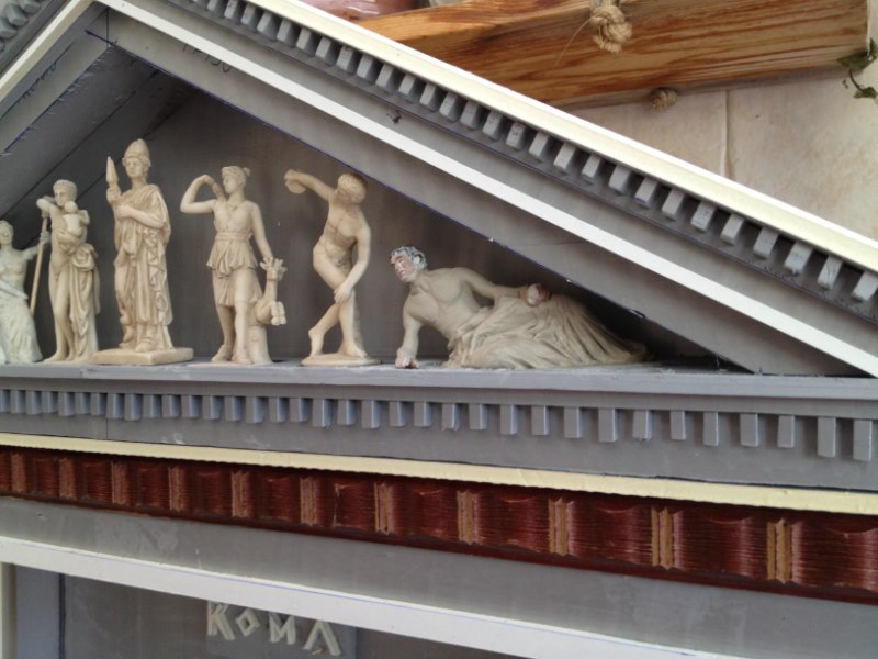 La Fuente de la Fortuna, es un proyecto que llevábamos en mente desde hacía tiempo. Es una fuente a tamaño real de construcción greco-romana arquitectónicamente hablando. Las figuras clásicas que aparecen en el frontón sin griegas, y dos de ellas tuvieron que ser modificadas. La segunda por la izquierda era la Venus de Milo, y la transformamos para que estuviera sentada y con brazos.