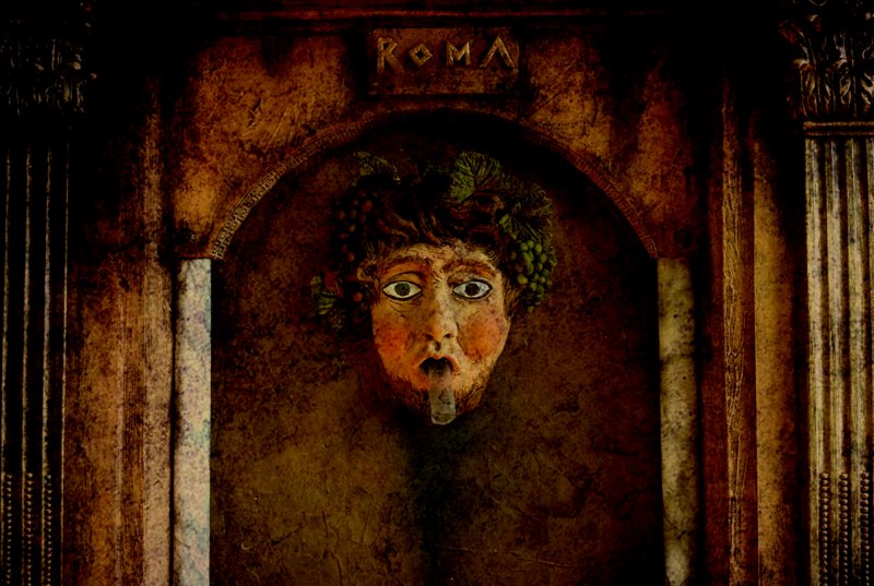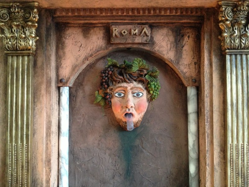 El rostro de Baco, a quien se le dedica la fuente en ésta historia ficticia que hemos inventado, está basado en pinturas dedicadas a la misma Deidad, con unos rasgos entre demoniacos y de un hombre que están sonrosado de tanto beber vino. En su boca tiene una trompeta dorada y de ella sale agua.