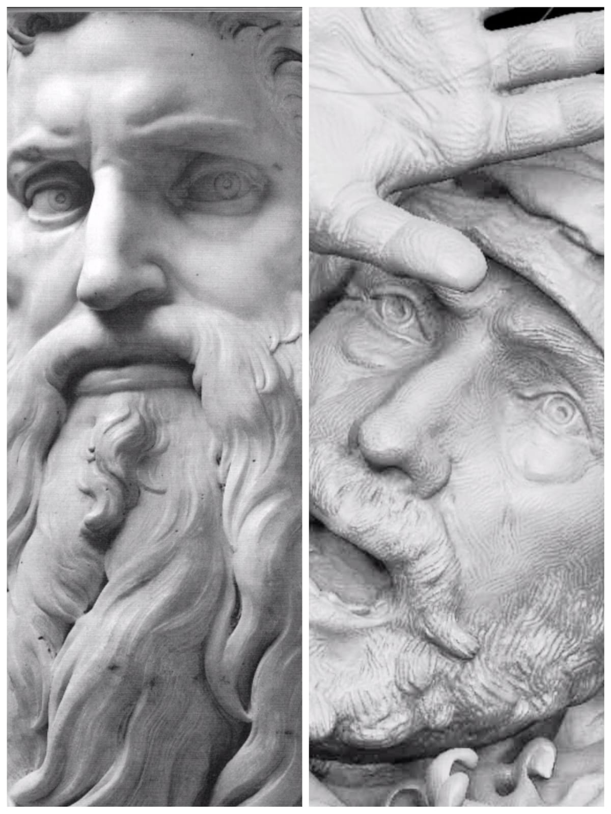 Igual realizó la misma comparativa con el Moisés(2,5m.) y un pastor(7/9,72/12,5 cms.) de Emilí...aunque es una trampa visual no tienen el mismo tamaño pero si la misma escala son comparables gracias al modelaje en 3D, una clave importante para poder llegar al detalle de una escultura de mayor tamaño que suple a la técnica de realismo extremo del Moisés.