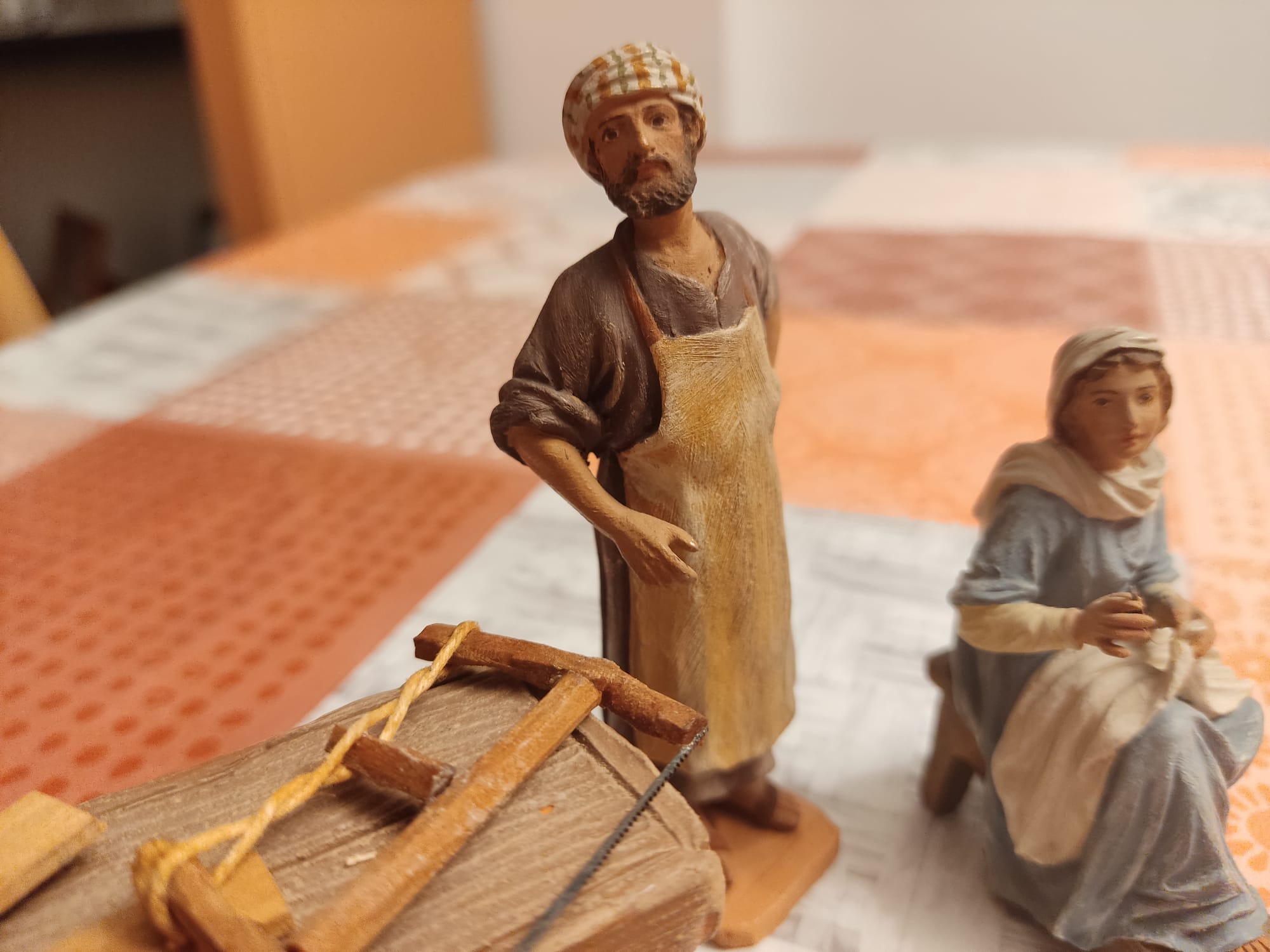 La figura de la Virgen cosiendo o hilando está pensada para la escena de El taller de San José en Nazaret . Por ejemplo estás dos de molde de 8cm.—de distintas épocas de la saga Castells— en el fondo de la imagen del montaje, la contraportada del libro El belén de España con dicha escena en un diorama de la ABM con palillos de Martí Castells.