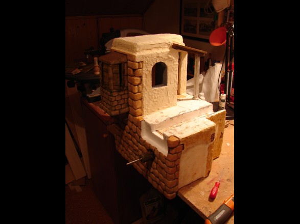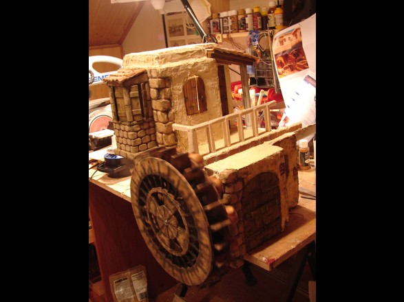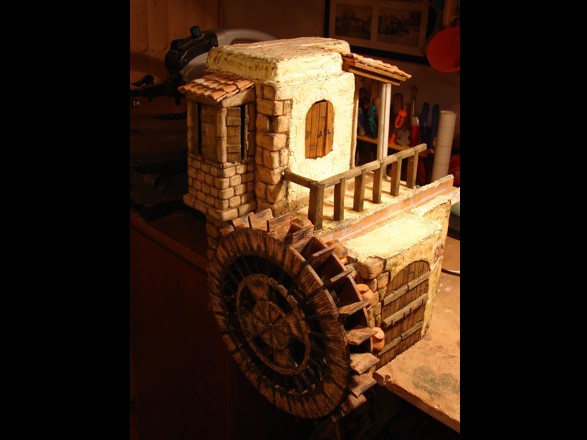 Para Pastorcillo de Almansa: Te diré y antes ya explique como pegúe el canal, respecto a la pasta es simplemente aguaplast, el mecanismo es un motor a 4.5 r.p.m. unido por un eje de acero inox. al centro de la noria y la pintura una pintura normal mate de manualidades, ah y un poco de imaginación de deben aportar tu.