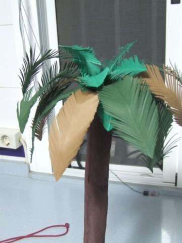 Esta año he hecho dos palmera iguales, de porexpan de duro y la corteza de papal pinocho, la hojas de varios tonos, y la base de porexpan cubierta de virutas de corcho.
