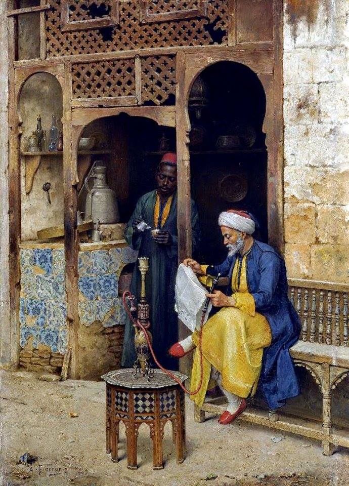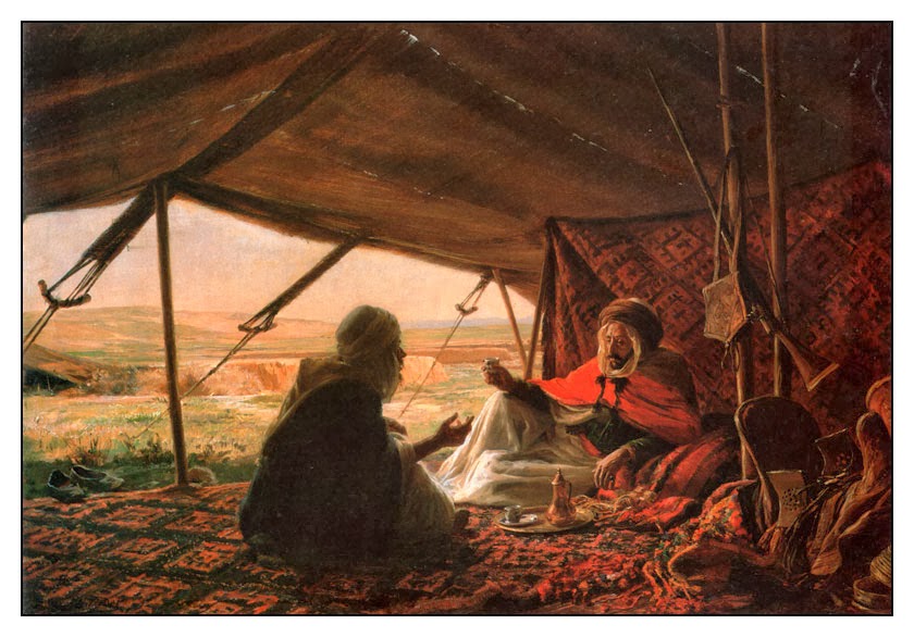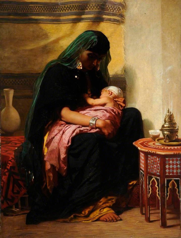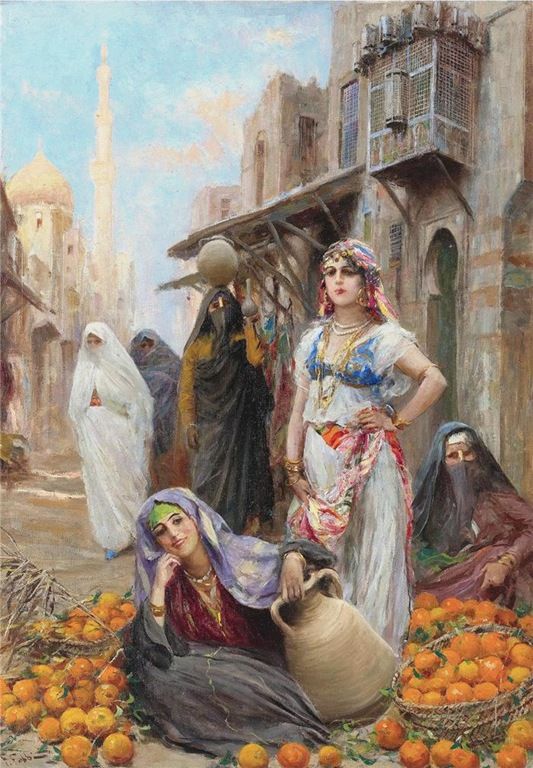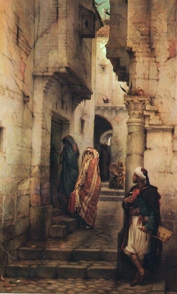 No olvidéis que los protas d e estos cuadros son árabes, y la familia que representamos era judía , pero yo creo que es la forma más cercana que tenemos d e poder reflejar el entorno d e Jesús ,supongo que con unos cuantos siglos antes ,la cosa seria un poquito más rustica pero ,seguro que había fruta, fuentes etc,etc, lo peor de todo es si mezclamos la pintura orientalista con otros estilos en el arte como el gótico, (ese estilo s e creo porque era una forma de reflejar que desde estas torres de la iglesias era lo más cercano que podíamos estar de Dios) y no me imagino a Jesús naciendo, en un Catedral, pobrecito si todo estaba lleno ,y tuvieron que irse a una cuadra ,pero seguro que la Virgen era previsora y llevo comida porque ellos no pedían limosna solo posada