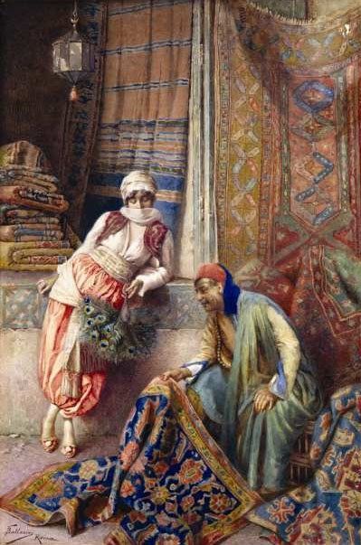 No olvidéis que los protas d e estos cuadros son árabes, y la familia que representamos era judía , pero yo creo que es la forma más cercana que tenemos d e poder reflejar el entorno d e Jesús ,supongo que con unos cuantos siglos antes ,la cosa seria un poquito más rustica pero ,seguro que había fruta, fuentes etc,etc, lo peor de todo es si mezclamos la pintura orientalista con otros estilos en el arte como el gótico, (ese estilo s e creo porque era una forma de reflejar que desde estas torres de la iglesias era lo más cercano que podíamos estar de Dios) y no me imagino a Jesús naciendo, en un Catedral, pobrecito si todo estaba lleno ,y tuvieron que irse a una cuadra ,pero seguro que la Virgen era previsora y llevo comida porque ellos no pedían limosna solo posada