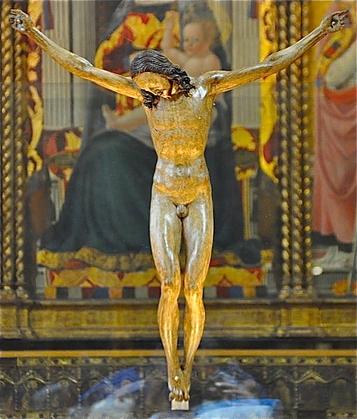 es bién ese crucifijo de Benvenuto Cellini , totalmente desnudo pero insigne obra religiosa y artistica , que sin ningún desconcierto veneraría ofreciendole el incienso igualmente con todo corazon y humildad .