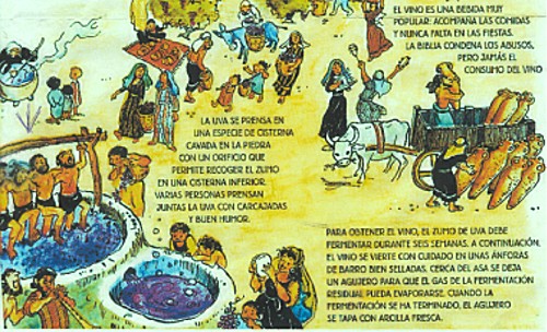 Las uvas rojas se pisaban en el lagar; sólo en los últimos siglos anteriores al cristianismo hubo también ocasionalmente lagares de vigas, parecidos a las almazaras de aceite. El vino formaba parte de todas las comidas festivas, y por supuesto de todas las bodas. Se le rebajaba con agua y a menudo se le adobaba con especias. Especial preferencia gozaba el adobo con miel, que lo convertía en “vino dulce” (Act 2:13). Para hacerlo al mismo tiempo más fuerte se mezclaba con una buena presa de pimienta. Pero había otras especias para la mezcla. También se bebía mucho el vino con hierba de ajenjo; era el “vino amargo.” Un sabor totalmente especial era, además, el del “vino ahumado,” que era el vino cuyas uvas había madurado por la acción del humo caliente. Entre los cometidos del repostero entraba también el de preparar la mezcla adecuada de las especias.