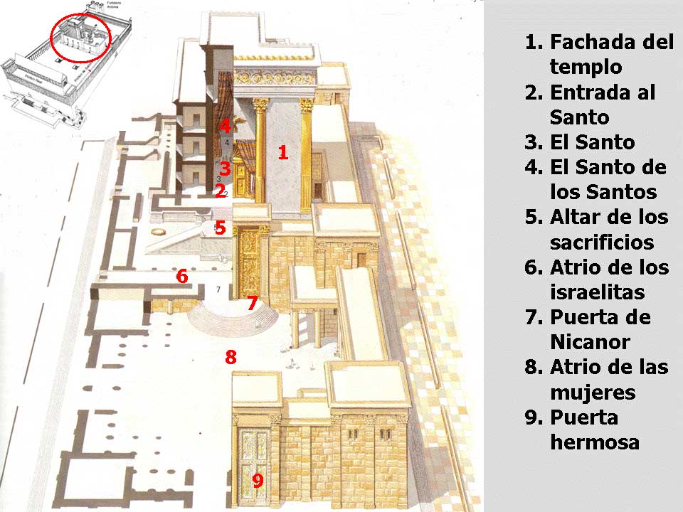 José, ahora termino de leer lo que has puesto sobre el Templo y la verdad, no se a que diferencia te refieres. Posiblemente te refieras al edificio del santuario que hay dibujado en la pagina 20 del libro "La vida diaria en tiempos de Jesús" de M. F. Vamos, que aparece el Santo de los Santos un poco mas bajo que el que aparece en la maqueta del hotel Holyland, ¿es a eso a lo que te refieres?, porque en las demás figuras no encuentro ninguna diferencia.