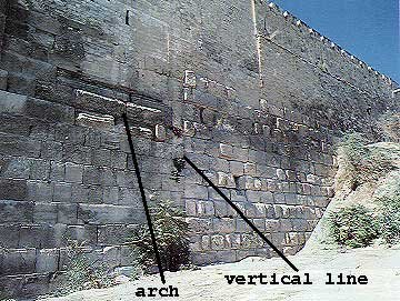 Los arcos de la puerta triple, en forma de arco de todo punto (creo que se denominan así), no son los originales, sino que fueron rehechos por los cruzados, ya que en esta parte quedo parcialmente destruido el muro . Los originales eran como los de la puerta doble, esto es, tenían un dintel recto superior y encima de este había un arco para disminuir la presión de tanta carga de piedra que tenia encima (fig. 16), ya que sino se podría producir la fractura del dintel. Dicho arco se puede hoy día observar, aunque tapado por piedras menores, en lo poco que se ve de la puerta doble
