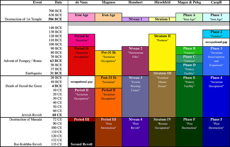 En el momento la excavación del Tell, se aceptó como indiscutible el hecho de que sus habitantes habían sido las mismas personas, que las que escondieron los manuscritos en las cuevas, y las mismas personas de cuya comunidad nos hablan los documentos hallados. Pronto también se les identificó con la secta de los esenios de la que nos hablaban los historiadores judíos y romanos.
