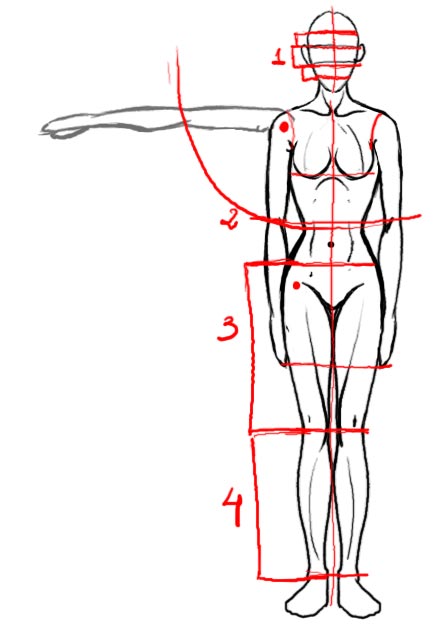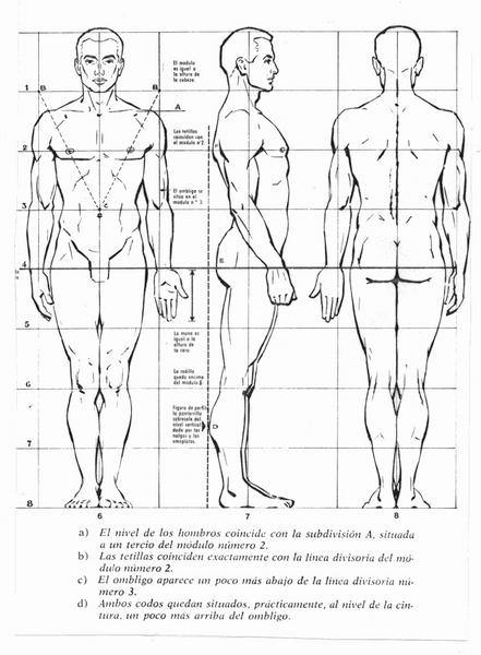 -El brazo medirá 2 cabezas y tres cuartos desde donde se articula el hombro hasta la articulacion de la mano.Ademas la linea del ombligo coincide casi exactamete con el codo.