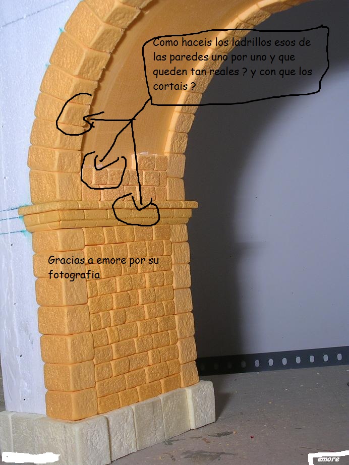 En la foto del MAESTRO son ladrillos cortados y pegados uno a uno. Se cortan con cuter (evidentemente) y el efecto a piedra, emore lo hace golpeando los ladrillos con un cepillo de puas de alambre.