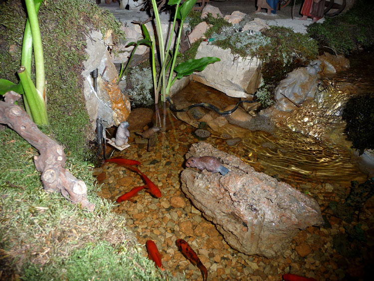 Yo no quería hablar del lago con peces que hay en el “Pessebre monumental del Xiquets de Tarragona”, porque creo que es otra historia muy distinta. En dicho pesebre hay varios circuitos de agua, ya que la potencia e intensidad del agua es distinta en la cascada, el río y en la llegada al lago. Está todo muy controlado con tres bombas distintas ya que en la cascada se necesita mucha agua, para darle espectacularidad y potencia, en el transcurso del río, la necesaria para que no desborde y de el efecto de agua corriente, relativamente suave y en el lago el agua que llega es la misma del lago que pasa por una bomba-filtro para que no sufran los peces. El lago en cuestión, es un recipiente de acero inoxidable hecho artesanalmente a medida, que luego va recubierto con todos los adornos, plantas, piedras, etrc..que precise. Como veis, todo es un poco complejo. Los acuarios tienen unas bombas que aspiran el agua del fondo, previo recubrimiento de la gravilla especifica de los acuarios, y expulsa en la parte superior, es por esta razón que la bomba no aspira a ningún pez. No se si esto os ha servido de algo, desearía que así fuera.