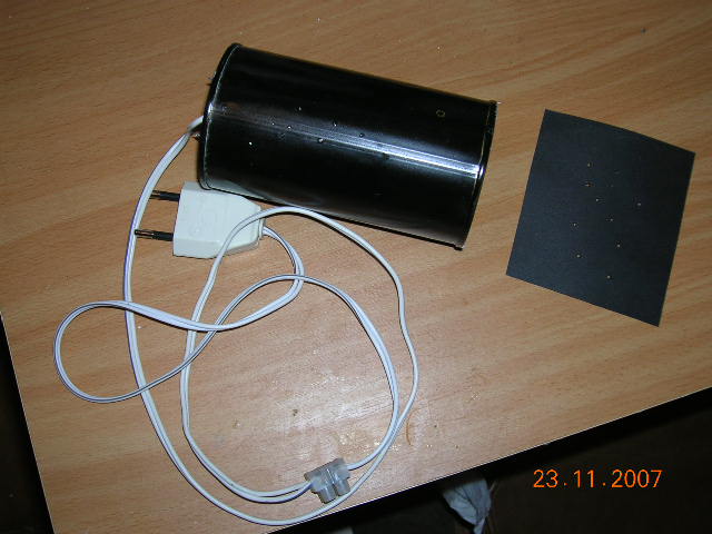 Hola a todos los foreros, hemos cogido un bote de aceitunas y lo he pintado con expray de color negro, una vez que ya secado la pintura le puse un casquillo en parte de la tapa pero por dentro y una bombilla, delante de la bombilla lo he puesto una cartulina negra con agujero de una aguja para las estrellas y le tapo delante del bote, al inluminar salen como rayitas, mi pregunta es: como lo hago o como se hacen los agujeros de una cartulina o otro similar para que salgan bien las estrellas a inluminar al celaje? hay te dejo una foto para que lo vea. un saludo y gracias