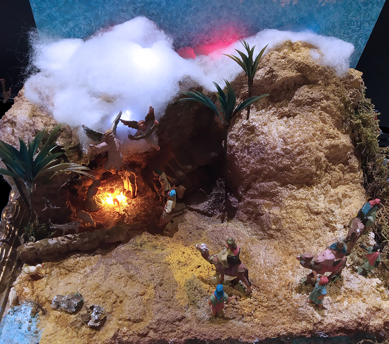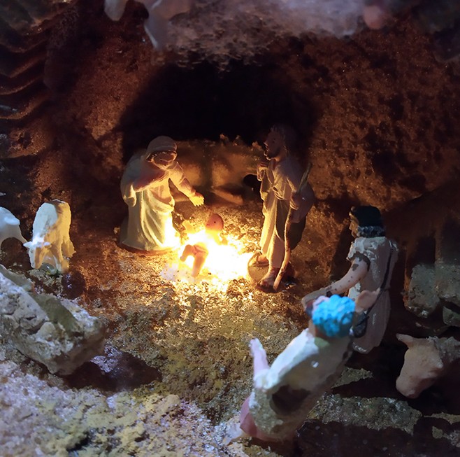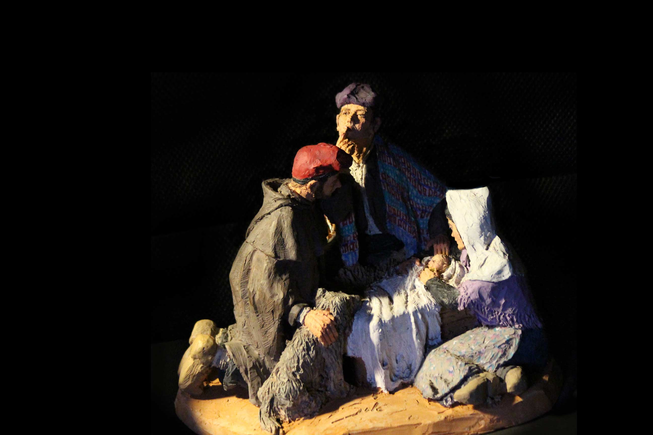 El efecto dramático y fosforescente del Niño, se consigue con figuras de Pech y con un led desde atrás y enterrado.