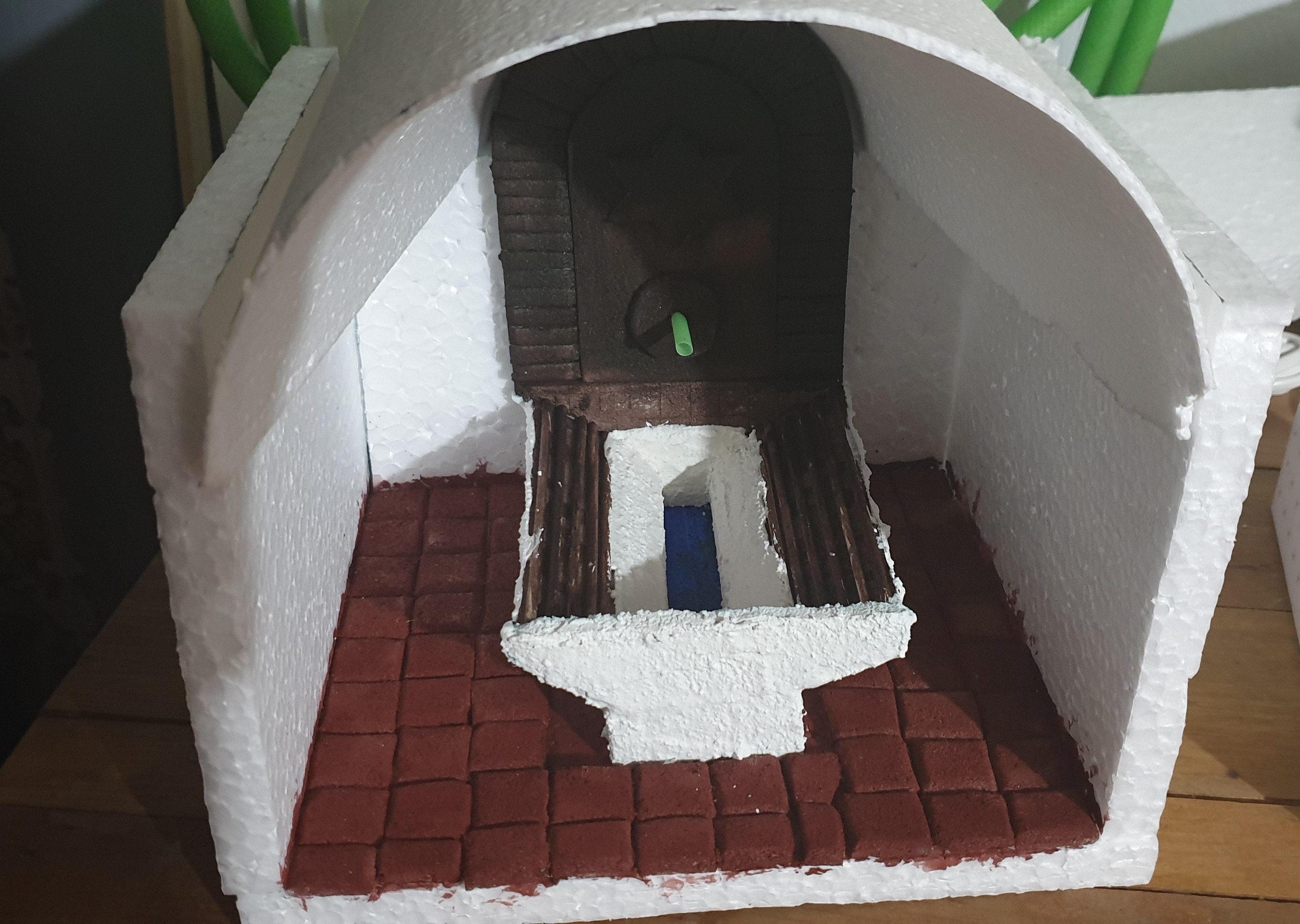 1.- Primero hago el planteamiento con la figura al lado para el tamaño. El suelo y el fondo tienen madera de balsa para que tenga consistencia y he hecho las paredes y el suelo de poliestireno expandido (el de bolitas).