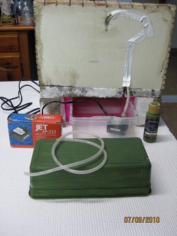 El lavadero está hecho con porex estruido, tres fiambreras(cajas de plástico pintadas por fuera con pintura Americana color verde avocado)un motor de fuente de Oliver.El caño es un tubo de metal ,la cabeza de león y el trozo de pared que va dentro del agua es de resina