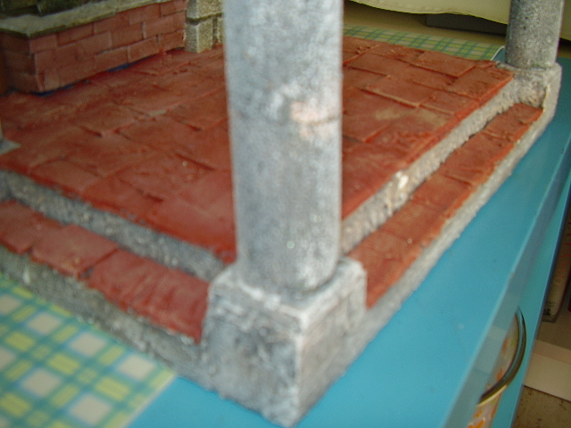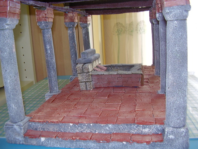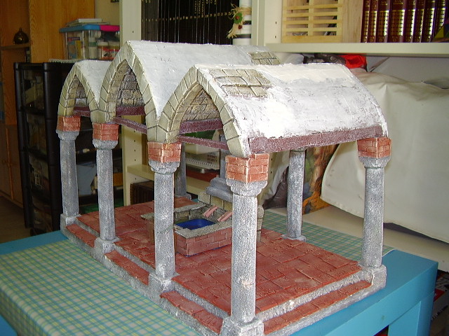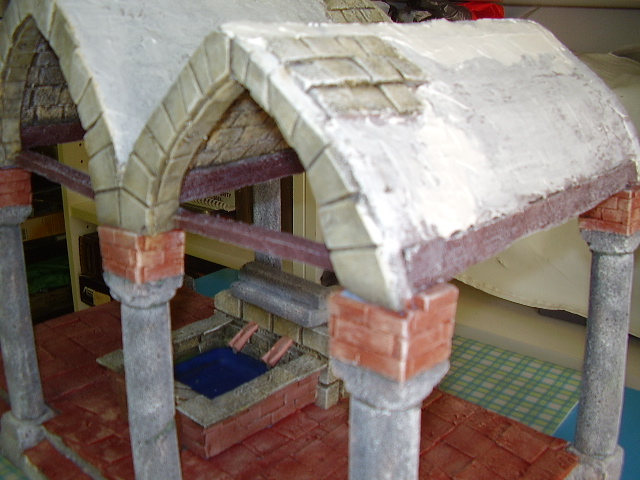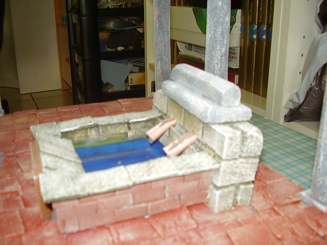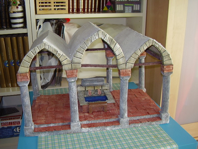 Este año comencé pronto. Tengo hecho este edificio desde hace unos meses. Ya le ha dado tiempo a romperse y ser restaurado de nuevo. No he seguido ningun plano, pero pienso que el tamaño corresponde a figuras de ocho y diez centímetros. Tengo pendiente hacer una lavandera estilosa y unos bancos para las reuniones de las señoras. La fuente no tiene motor, pero en su momento, se podrá llenar de agua por que es un recipiente de tupervare (creo que se escribe así). Espero que les guste.