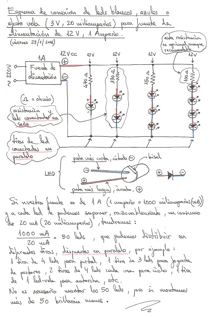 Si es más de 1 led tienes que ponerlos en serie. Estas son ideas básicas para leds blancos, azules y también efecto vela; rojos o verdes tienen otros valores de funcionamiento diferentes aunque muy parecidos. Por supuesto estos cálculos dependen de la salida del adaptador que en mi caso, como te he dicho, es de 12 V.