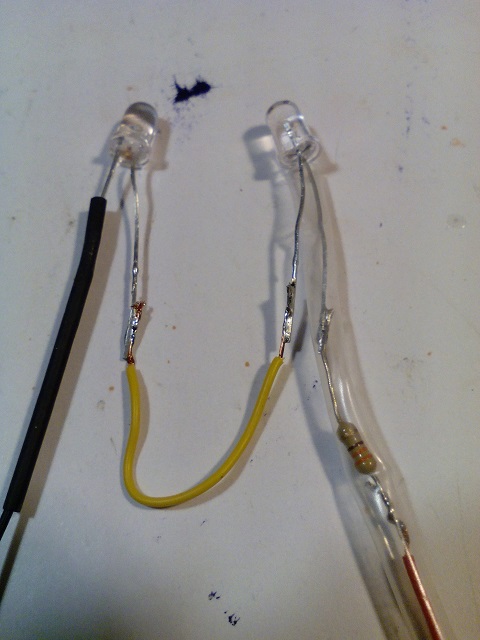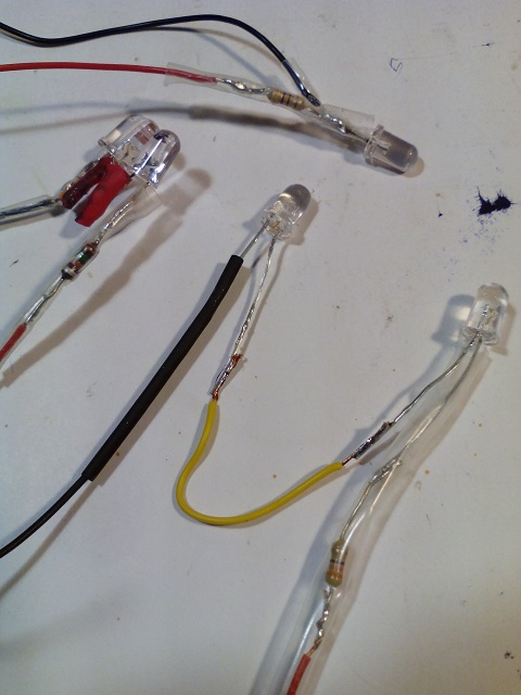 Resistencia para 1 led: voltios a "eliminar"=12-3=9V; resistencia=9/0.02=450 ohmios, el valor comercial más próximo es de 470 ohmios.