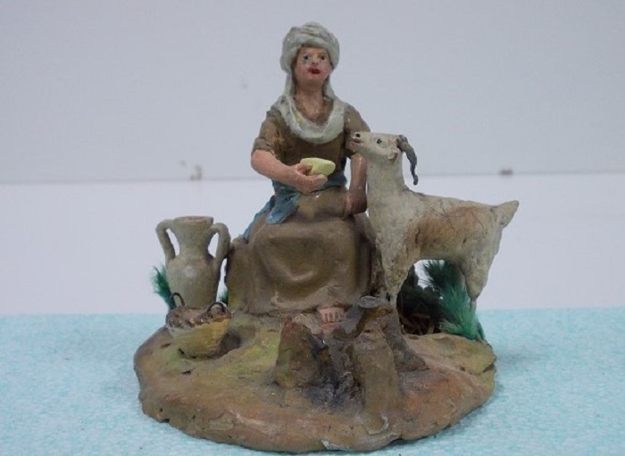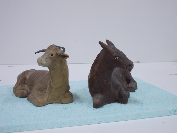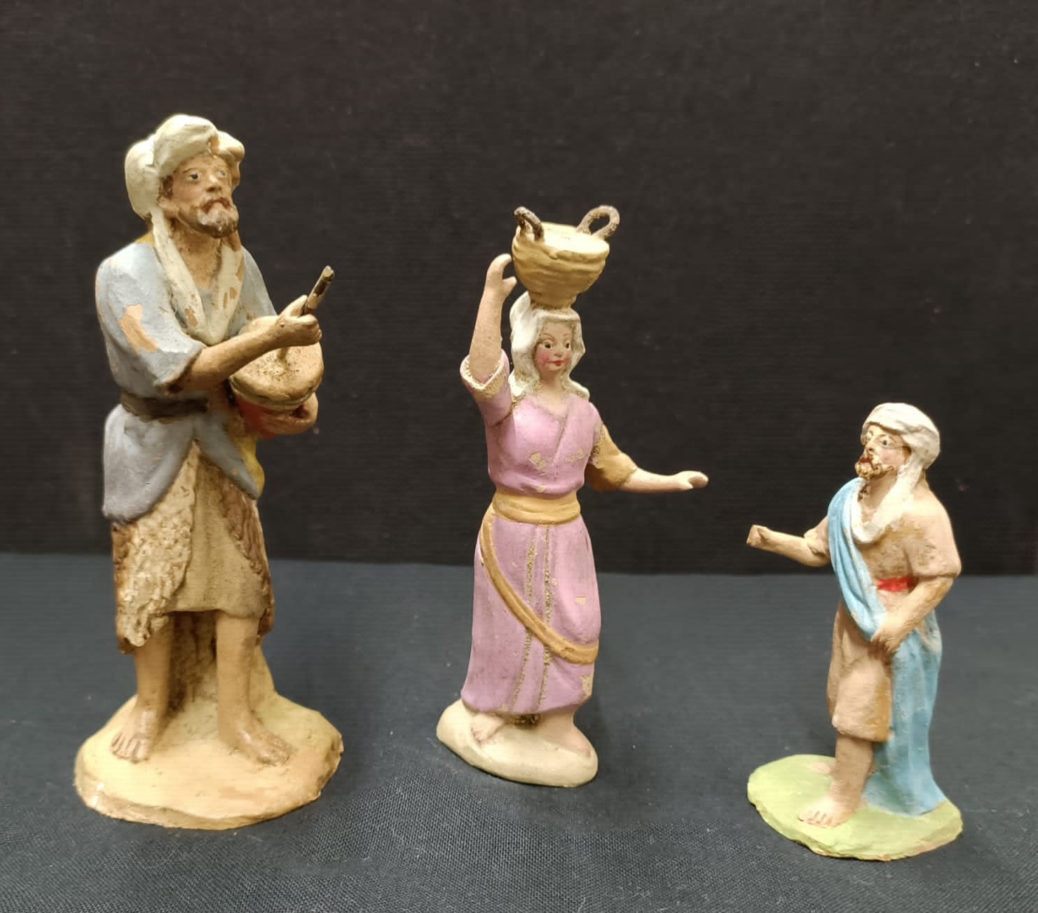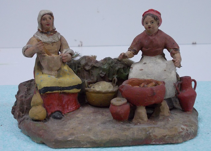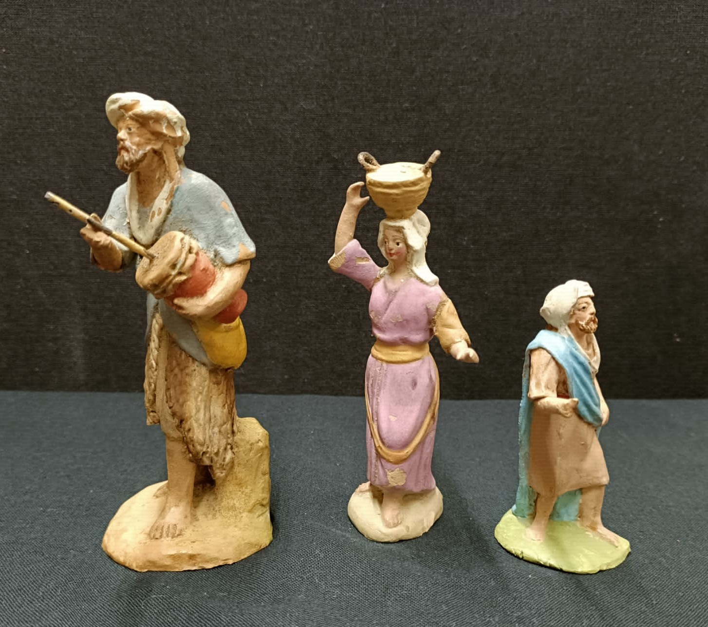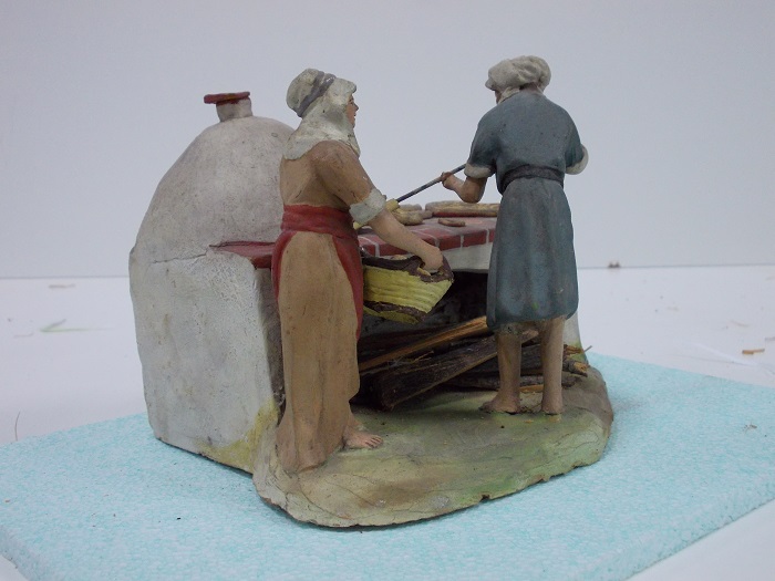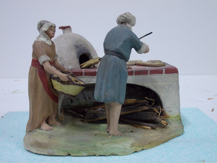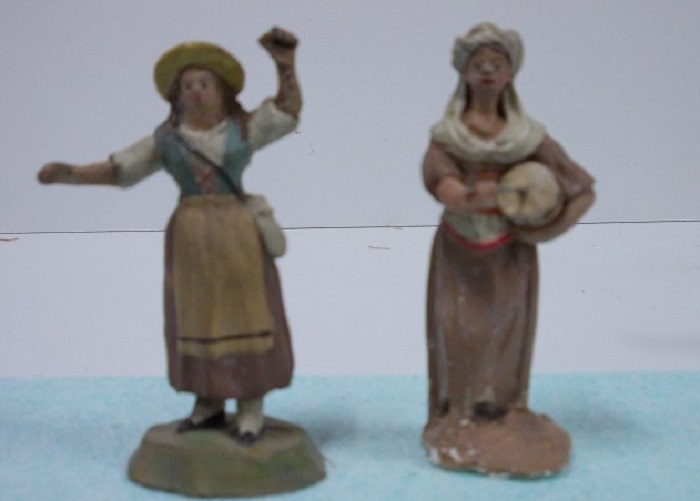 Son figuras de terracota, hechas en molde, pintadas a mano después de cocidas y encoladas en una peana.