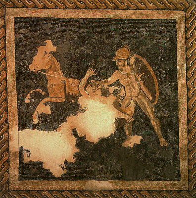 Recibe este nombre una mansión en el que se ha encontrado un mosaico muy importante: El Mosaico de Aquiles. El mosaico de Aquiles cubre una habitación de 10,15 x 7,21 m., habiéndose perdido una décima parte del mismo. Está formado por material pétreo mayoritariamente, en una amplia gama de colores: dos tipo de blanco, negro en seis tonos distintos, rosas, rojos en tres tonos, azules oscuros, grises y verdes. También aparecen materiales vítreos: varias clases de azul, amarillo brillante, naranja, rojo y verde, todos ellos muy vivos.